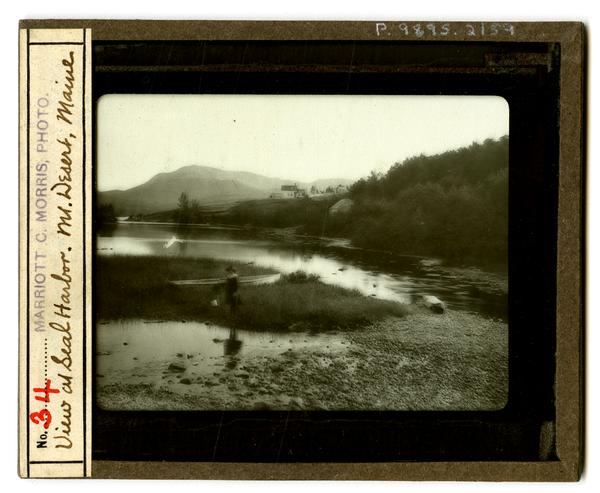 Lantern slide showing a view of Seal Harbor with rocky shallows and a grassy island in the center at Mount Desert Island. A canoe rests on the island and a girl wearing a lace collar and a hat stands in the grass. Mount Desert Island, the largest island off the coast of Maine, was popularized in the mid-19th century by Hudson River School painters as a nature retreat. From the late 19th century to around the 1930s the Island was a tourist destination for the social elite.