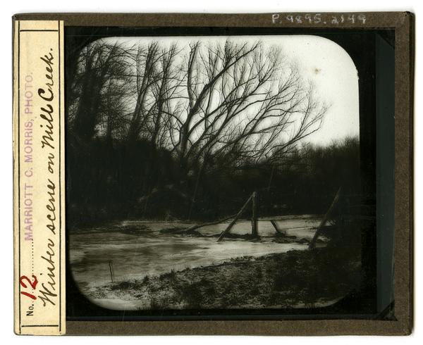 Lantern slide showing a view of Mill Creek. A rough hewn wooden fence extends into the creek from the left and the branches of a tall fallen tree lay over the water on the right.