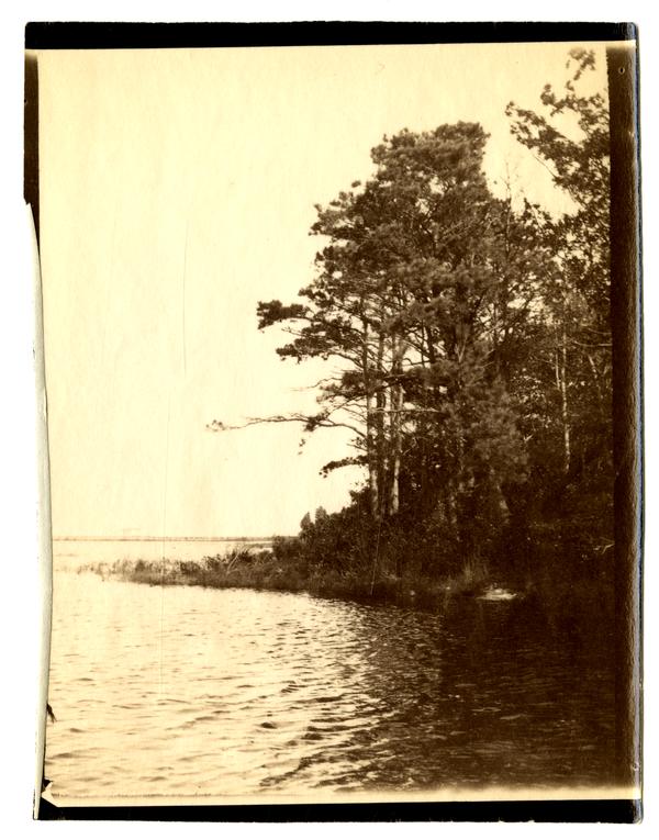 Photograph showing a view of the tree lined shore of a river or lake. Slender trees crowd the bank and reeds extend into the the water.