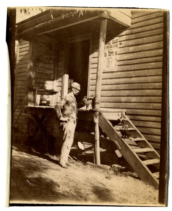Photograph showing a man standing next to a stairway on the side of a wooden building petting a kitten. Two other kittens stand on the stairs next to the building. A sign reading, "Great [An]nual Sale..." hangs near the entrance above the stairs.