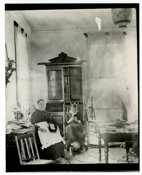 Photograph showing a view of an interior, possibly at the Morris family home Avocado, decorated with a large secretary, a table piled with books, and various chairs. Two women sit in front of the secretary doing handwork. Tall windows covered with sheer curtains let light into the room. Elliston Perot Morris bought property in Sea Girt, N.J. in 1875, where he built the summer home Avocado after designs by Quaker architect Hibberd Yarnall. Morris left Avocado, named after a Perot family estate in Bermuda, to his daughter Elizabeth Canby Morris in his will. It was sold in 1947 after her death. By 1958 the house had been demolished.
