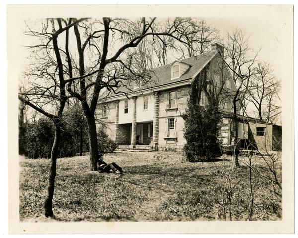 Photograph showing Bartram's House, a two-story stone house with three engaged stone columns decorating the front facade. The house has three dormer windows on the roof and is surrounded by trees. Marriott C. Morris' brother Samuel Buckley Morris sits in the front yard beneath a tree. Bartram’s Gardens, founded by American botanist John Bartram, is the oldest surviving botanic garden in North America. Built in 1728, the gardens cover forty-six acres with a focus in North American plants. The Gardens became a Philadelphia city park in 1891. Bartram’s stone house was originally built 1728-1731.
