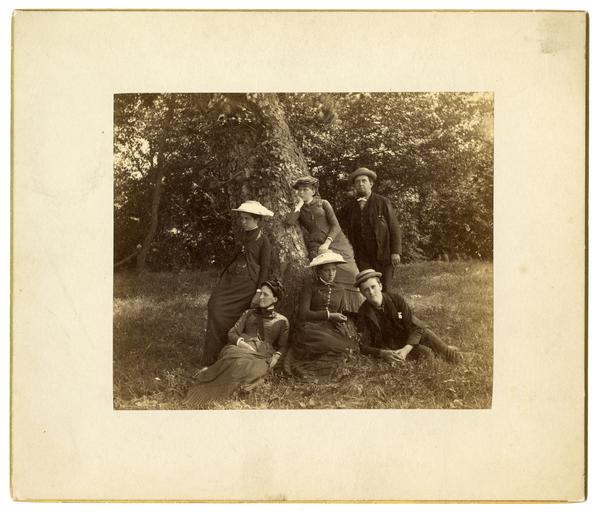 Photograph showing a group portrait of Marriott C. Morris' parents Elliston P. Morris and Martha Canby, siblings Samuel Buckley Morris and Elizabeth Canby Morris, and Anne Emlen and Mary Emlen next to a tree in Allaire, N.J. Elliston Morris stands, Mary Emlen and Elizabeth Morris lean against the tree and the others lounge in the grass. Each person looks in a different direction. The print is mounted on a cream colored board with a gold border. James P. Allaire (1785-1858) founded the Allaire Iron Works Company (later Howell Iron Works) in 1815. Allaire, New Jersey became a factory town for the company that built engines for steamboats circa 1824. The row homes for workers were completed in 1833, the blast furnace was made in 1831, and the Episcopalian church was built 1832-1836. Financial difficulties and discovery of iron ore deposits in Pennsylvania closed the Company in 1850. In 1957, the land was bought by Allaire Village Inc. and turned into a historic village.