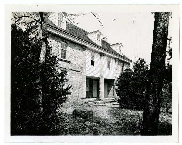 Photograph showing Bartram's House, a two-story stone house with three engaged stone columns decorating the front facade. The house has three dormer windows on the roof and is surrounded by trees. Bartram’s Gardens, founded by American botanist John Bartram, is the oldest surviving botanic garden in North America. Built in 1728, the gardens cover forty-six acres with a focus in North American plants. The Gardens became a Philadelphia city park in 1891. Bartram’s stone house was originally built 1728-1731.