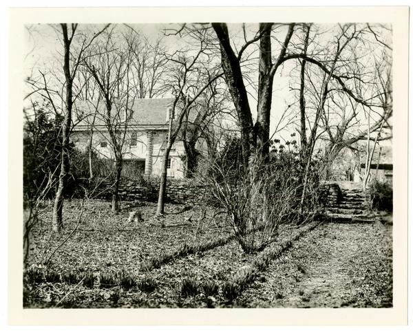 Photograph showing Bartram's House, a two-story stone house with engaged stone pillars and dormer windows seen from a garden. The garden is dotted with trees and shrubs and bordered by low, prickly plants. Fallen leaves cover the ground. Bartram’s Gardens, founded by American botanist John Bartram, is the oldest surviving botanic garden in North America. Built in 1728, the gardens cover forty-six acres with a focus in North American plants. The Gardens became a Philadelphia city park in 1891. Bartram’s stone house was originally built 1728-1731.