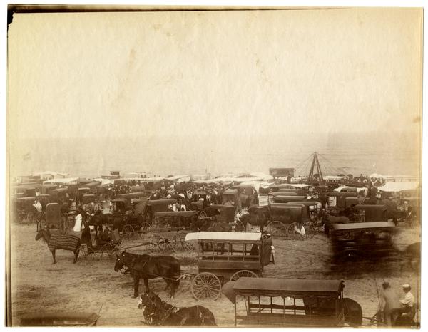 Photograph showing a large group of horse-drawn carts, wagons and people gathered on the beach for Jersey Wash Day. Canopies are strung over stalls near the shore. The ocean extends into the background. Jersey Wash Day, also known as Salt Water Day or Ocean Day, was an annual event held the second Saturday of August near Wreck Pond in Sea Girt. Farmers living twenty to thirty miles from Sea Girt came to the sea to spend a day bathing and celebrating. The tradition, begun before 1853, stopped around the 1930s.