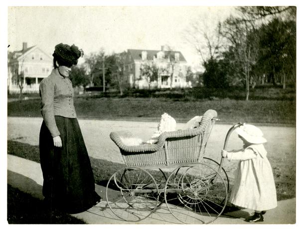 Photograph showing Marriott C. Morris' wife Jane Rhoads Morris standing over their children, Elliston Perot Morris Jr. and Marriott Canby Morris Jr. near their home at 6706 Cresheim Road. Elliston Morris as a toddler pushes Marriott Morris Jr. as a baby in a carriage down the sidewalk. Jane Morris wears a long skirt and jacket with a a decorated hat. The children wear white frocks and bonnets.