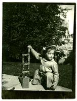 Photograph showing Marriott C. Morris' son Elliston Perot Morris Jr. as a young boy playing with wooden blocks in the garden at their home at 6706 Cresheim Road. He wears a hat and crouches on the ground next to the blocks. A stone wall and thick foliage stand behind him.