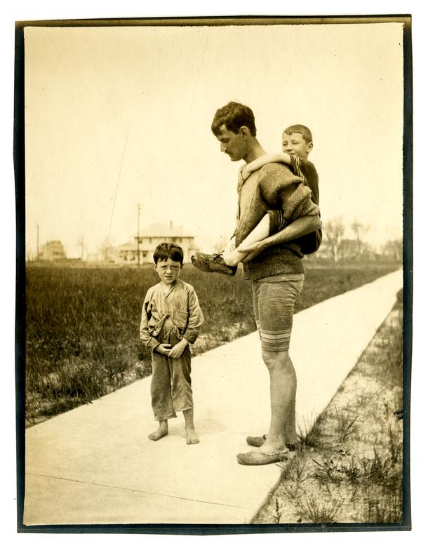 Photograph showing a man and boy from the Boys’ Parlors Association wearing bathing suits at Wildwood, N.J. The man carries the boy on his back. Another boy wearing loose fitting clothing stands next to them on the sidewalk. Founded in 1887, the Boys’ Parlors Association of Germantown served as a safe space for neighborhood children whose parents worked longer hours in an industrializing city. The name changed in 1907 to the Germantown Boys’ Club after joining ranks with the Boys and Girls Clubs of America. Marriott Canby Morris served as the president of the club in the first decade of the 1900s. Wildwood began developing as a coastal resort town in the 1890s, growing dramatically in popularity in the 1950s. The area was incorporated as a city in 1912.