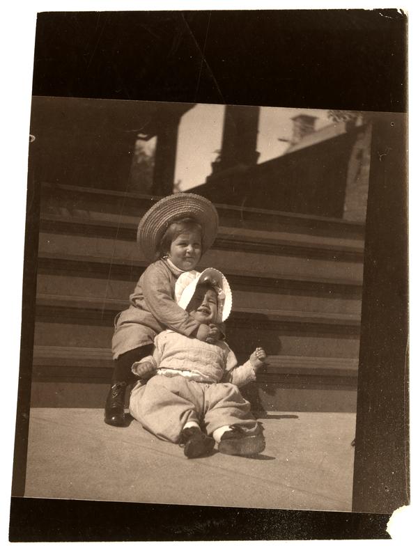 Photograph showing Marriott C. Morris' sons Elliston Perot Morris Jr. and Marriott Canby Morris Jr. as children seated on their porch steps at 6706 Cresheim Road. Elliston Morris wears a wide brimmed straw hat and wraps his arms around Marriott Morris Jr. who sits on the ground with an unhappy look on his face.
