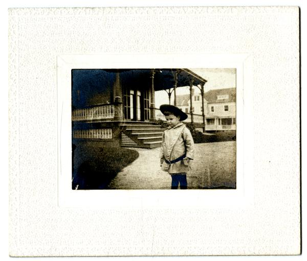 Photograph showing Marriott C. Morris' son Elliston Perot Morris Jr. as a young boy standing on a path in front of the porch of the Morris family home Avocado. He wears a dark wide brimmed hat and a light jacket with a belt. Elliston Perot Morris bought property in Sea Girt, N.J. in 1875, where he built the summer home Avocado after designs by Quaker architect Hibberd Yarnall. Morris left Avocado, named after a Perot family estate in Bermuda, to his daughter Elizabeth Canby Morris in his will. It was sold in 1947 after her death. By 1958 the house had been demolished.