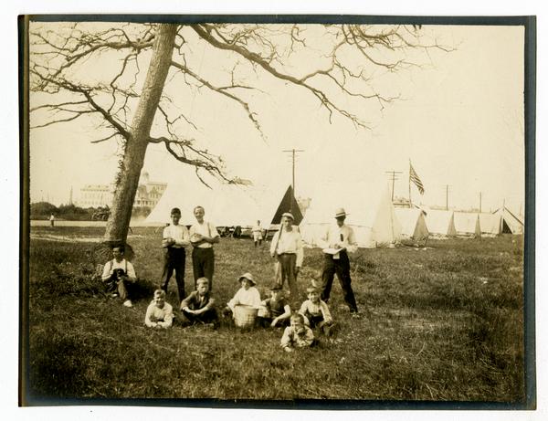 Photograph showing a group of men and boys from the Boys' Parlors Association gathered in a field in front of a group of tents at Wildwood, N.J. Some boys sit in the grass, another sits under a tree, and the older young men stand. A large building stands in the far distance. Founded in 1887, the Boys’ Parlors Association of Germantown served as a safe space for neighborhood children whose parents worked longer hours in an industrializing city. The name changed in 1907 to the Germantown Boys’ Club after joining ranks with the Boys and Girls Clubs of America. Marriott Canby Morris served as the president of the club in the first decade of the 1900s. Wildwood began developing as a coastal resort town in the 1890s, growing dramatically in popularity in the 1950s. The area was incorporated as a city in 1912.
