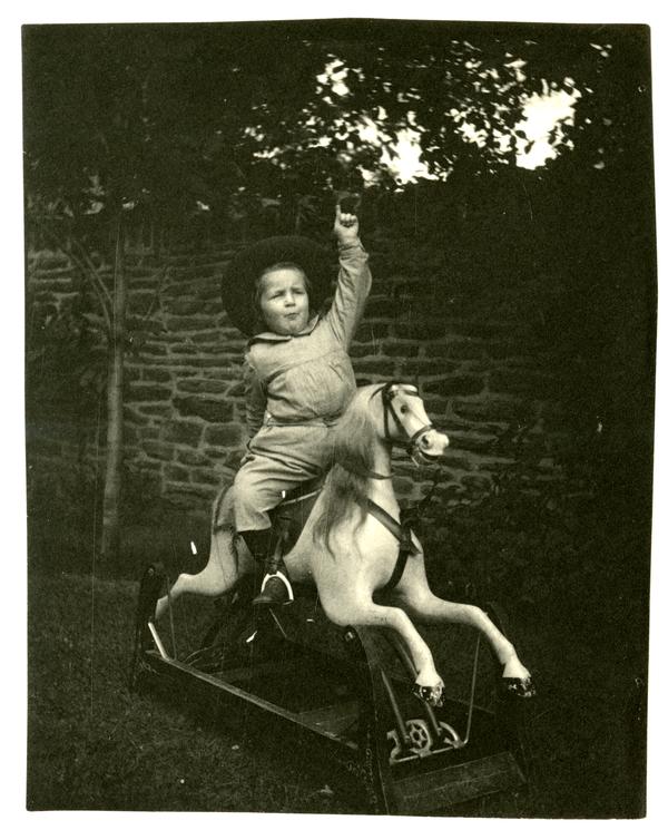 Photograph showing Marriott C. Morris' son Elliston Perot Morris Jr. as a child riding a hobby horse in their garden at 6706 Cresheim Road. He holds onto the back of the horse with his right hand and points his left hand toward the sky. He wears a wide-brimmed hat. A brick wall borders the garden in the background.
