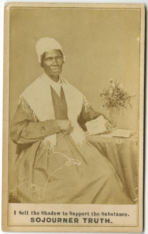 Three-quarter length portrait of the African American itinerant preacher, abolitionist, and women's rights advocate born into slavery and originally known as Isabella Baumfree. Shows Truth, seated, and attired in a dark-colored, long sleeved dress with white collar, white shawl with fringe, and a white cap. She wears wire-rimmed glasses and faces front and is turned slightly to her left. She holds knitting in her left hand which rests on a small table that has a decorative table cloth. A notebook and vase of flowers adorn the table. A string of yarn runs across her lap. Truth escaped to freedom in 1826. During the period of the Civil War, Truth captioned, marketed, placed under copyright, and sold at least eleven different carte-de-visite portraits of herself at her lectures and through the mail to earn personal funds and advocate for the abolition of slavery. Her knitting probably alludes to her promotion of the handcraft as an industry for advancement for former enslaved persons.