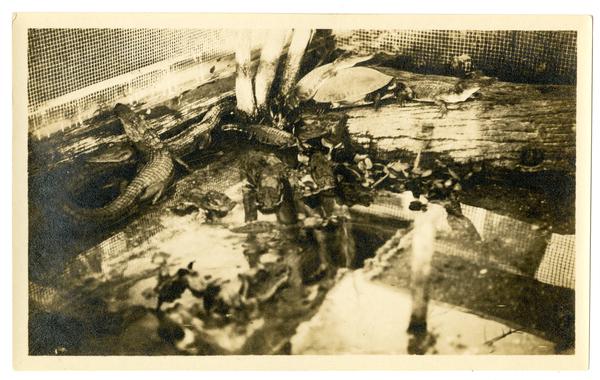 Photograph showing a view of a group of alligators in an enclosure, likely in Jacksonville, Florida. The enclosure includes a pond, a tree, and various other foliage.