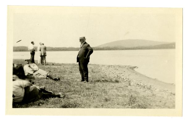 Photograph showing a group of men resting in the grass near Ponkapoag Pond. A man wearing a straw hat with his hands on his