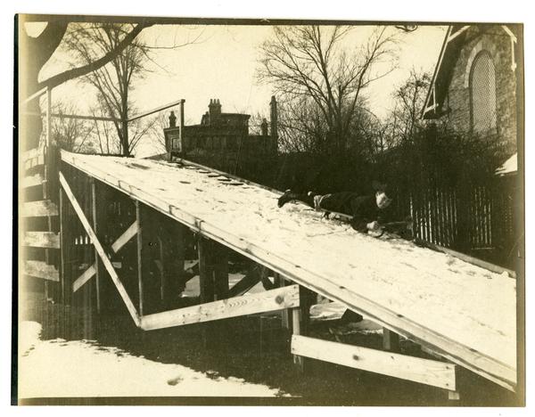 Photograph showing Marriott C. Morris’ son Marriott Canby Morris Jr. as a boy sledding down a snowy ramp on his stomach at their home at 131 W. Walnut Lane.