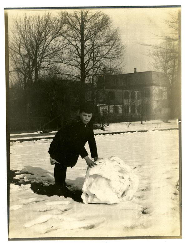 Photograph showing Marriott C. Morris’ son Marriott Canby Morris Jr. as a boy rolling a large snowball across a snowy field, likely at their home at 131 W. Walnut Lane. He wears a dark jacket. A path crosses the field in the background and houses are visible behind the path.