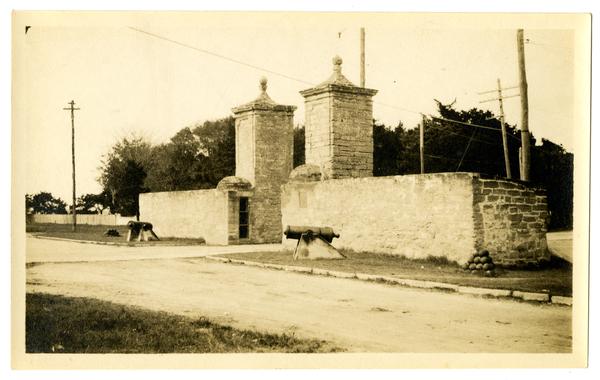 Photograph showing a view of a large stone entryway comprised of two towers flanking a road, likely at Jacksonville, Florida. Two cannons stand under the towers and two piles of cannonballs stand to the right of each cannon.