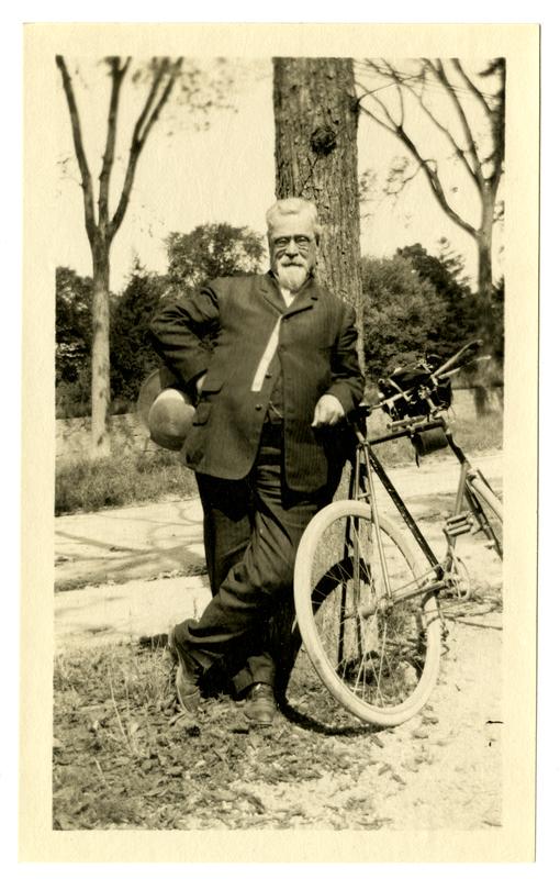 Photograph showing a man leaning against his bicycle in front of a tree, likely at Massachusetts. He wears a three-piece suit
