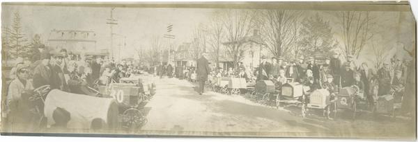Panoramic view showing several boys, attired in hats, coats, and often goggles, in pushmobiles lined on each side of a residential street in preparation for a race. Boys stand behind the vehicles, while men, including a police officer and likely officials, walk and convene at the other end of the street. Many of the pushmobiles are numbered and some are named, including one with the moniker "Otto." The pushmobiles are possibly participating in the first Thanksgiving Pushmobile Derby that occurred in 1911. The race was one of several throughout the city, including also in West Philadelphia, South Philadelphia, and in Center City.