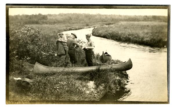 Photograph showing three men standing on the Egg Harbor riverbank next to two canoes. The men wear hats and have their sleeves rolled up. A knapsack rests in the grass to the left of the canoes.
