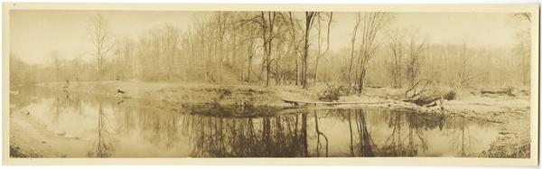 Panoramic view showing a curved stretch of the creek. Barren trees and brush line the bed of the creek in the background.