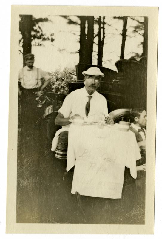 Photograph showing a man wearing a hat and glasses sitting at a small table in a clearing in the woods at Readville. Various cups sit on the table and a wagon stands behind the man. Another man reclines against the wagon wheel.