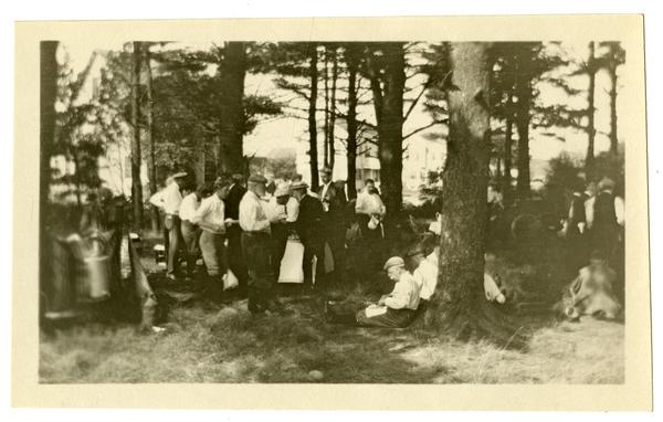 Photograph showing a group of men gathered in a clearing among the trees at Readville, Mass. Some men sit under the trees