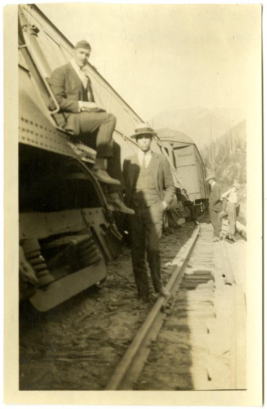 Photograph taken during a family trip to Canada and Washington state showing Marriott C. Morris' sons Elliston Perot Morris Jr. and Marriott Canby Morris Jr. standing next to a derailed train at Albert Canyon. The man on the left wears a close fitting cap and sits in a doorway in the train car. The man on the right wears a wide brimmed straw hat and stands on the rail with his hands in his pockets. Both men wear three-piece suits. Two other men stand in the background.