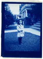 Photograph showing Marriott C. Morris' son Marriott Canby Morris Jr. as a young boy standing in their front lawn at 6706 Cresheim Road. He wears a straw hat and a sailor suit and has long hair. The corner of their front steps is visible to the right.
