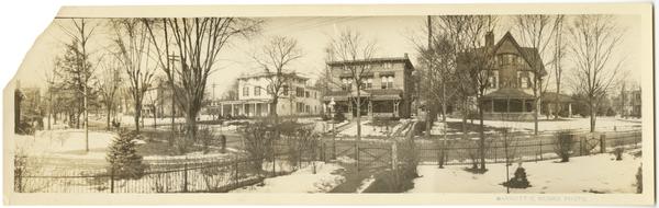 Panoramic view looking south and showing the 100 block of West Walnut Lane east of the Marriott C. Morris residence (131). Includes the Queen Anne-style residence of Mr. & Mrs. J. G. Lindsay (143) and the Italian villa-style residences of Mr. & Mrs. Louis H. Swind (149) and Alonzo P. Smith (155). Snow covers the front yards of the houses. Trees line the street. In the foreground, the snow-covered and fence-lined front yards of the opposite side of the street are visible. Image also depicts the residence east of Greene Street, a partial view of the Morris house, and distant views of the neighborhood in the background.