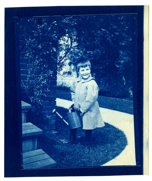 Photograph showing Marriott C. Morris' son Elliston Perot Morris Jr. as a young boy standing in the grass next to their porch steps at 6706 Cresheim Avenue. He waters a rose bush with a watering can. He wears a checkered frock and dark shoes and looks up smiling toward the camera.