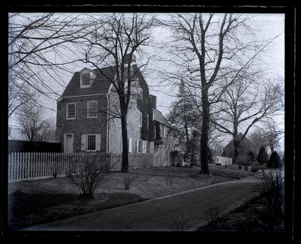 Glass negative showing the large stone home of Christian Lehman at 5524 Germantown Avenue. To the left of the house is a wooden fence and a road lined with trees. Christian Lehman was born in Germany in 1714 and immigrated to the United States in 1731. He worked as a land surveyor and flower merchant. By 1809, the house had passed to his son, Benjamin.