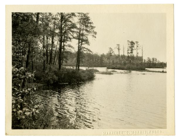 Photograph from a series of photographs taken by Morris during his excursion to Brown Mills, N.J. with the Photographic Society of Philadelphia. Shows a bucolic view of an unidentified river. Tall, slender trees grow on a small island in the middle of the water and on the riverbank. The Photographic Society of Philadelphia was founded in 1860 to promote the techniques and art of photography. Morris was a member of the Society by 1885.