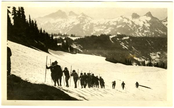Photograph taken during a family trip to Canada and Washington state showing a line of people each carrying a walking stick, climbing a snowy hillside at Mount Rainier National Park. Snow-capped mountains rise in the distances and trees grow in the foothills below the peaks. The national park Mount Rainier was established in 1899 around the Mount Rainier volcano.