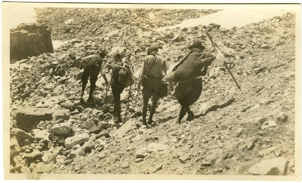 Photograph taken during a family trip to Canada and Washington state showing four people climbing down the Victoria Glacier hillside strewn with rocks near Moraine Lake. Each person carries a walking stick and a pack on their backs. The Victoria Glacier, located partially over Mount Victoria, was first recorded in photographs in 1897 by William Hittel Sherzer. It was subsequently photographed by Morris family friends George Jr., William, and Mary Vaux on and off from 1898 to 1912.