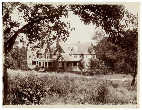 Photograph showing a view of Marriott C. Morris' two-story house at 6706 Cresheim Road seen from across a field from among a grove of trees. The house has a porch, is decorated with timber framing, and is connected to another house.