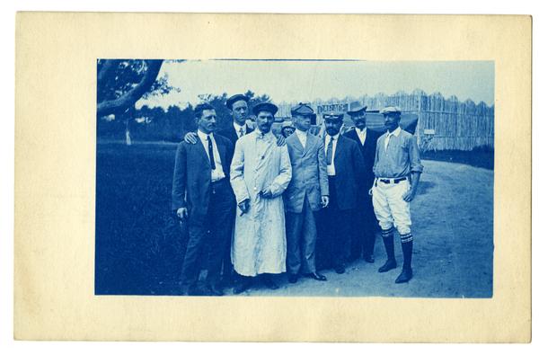 Photograph showing a group of men standing on a dirt road in front of a garage, likely in Massachusetts. One of the men wears a long white coat and holds a cigar in his hand. Many of the other men wear hats and suits.