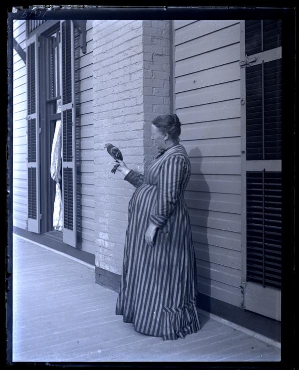 Glass negative showing Matilda Knox wearing a striped dress standing on a porch at the Morris family summer home Avocado in Sea Girt, N.J. A pigeon named Flora perches on her outstretched left hand. Elliston Perot Morris bought property in Sea Girt, N.J. in 1875, where he built the summer home Avocado after designs by Quaker architect Hibberd Yarnall. Morris left Avocado, named after a Perot family estate in Bermuda, to his daughter Elizabeth Canby Morris in his will. It was sold in 1947 after her death. By 1958 the house had been demolished. Matilda Knox was the housekeeper for the Morris family at Avocado.
