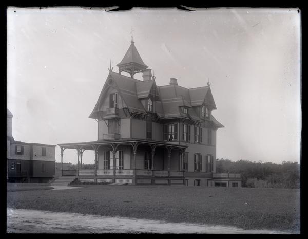 Glass negative showing a view of Avocado, the Morris family's multi-story house at Sea Girt, featuring a porch, tracery decoration in the gables, and a tower with a balcony. Another building is visible on the left and a lawn extends in front of the house. Elliston Perot Morris bought property in Sea Girt, N.J. in 1875, where he built the summer home Avocado after designs by Quaker architect Hibberd Yarnall. Morris left Avocado, named after a Perot family estate in Bermuda, to his daughter Elizabeth Canby Morris in his will. It was sold in 1947 after her death. By 1958 the house had been demolished.
