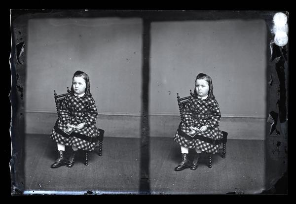 Glass negative showing a stereo portrait of a child with curled hair wearing a checkered dress and seated on a small chair. The child holds a cabinet card in his hands with a solemn expression on his face.