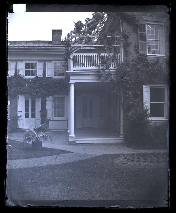 Glass negative showing the back porch of the Deshler-Morris House at 5442 Germantown Avenue taken from the yard facing the side of the house. Ivy grows over a balcony on the second floor and along the walls of the house. David Deshler built the original four-room summer cottage on this Germantown lot in 1752, adding the three-story front addition in 1772. The house was sold to Col. Isaac Franks in 1792 after Deshler’s death. President George Washington rented the home for the duration of the yellow fever epidemic of 1793 and the summer of 1794. Elliston and John Perot purchased the house in 1804, selling it to Elliston’s son-in-law Samuel B. Morris after his death in 1834. The house stayed in the possession of the Morris family for over a century, when Elliston P. Morris donated the house to the National Parks Service in 1948. The name was officially changed to the Germantown White House in 2009.