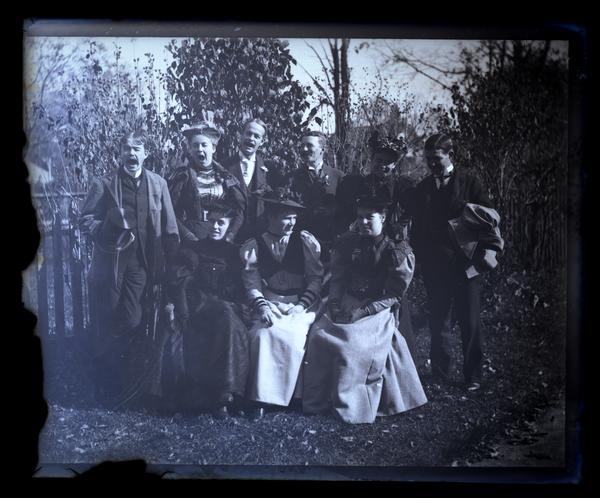 Glass negative showing a group of men and women laughing and making funny faces. Three women sit in the first row while four men and two women stand behind them. The women wear dresses with puffy sleeves and decorated hats. The men wear three-piece suits.