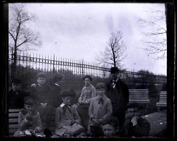 Glass negative showing a group of children posed on a bench. A man stands next to the group on the left and a metal fence separates the sidewalk from the foliage behind it. The children wear long coats, some with hats.