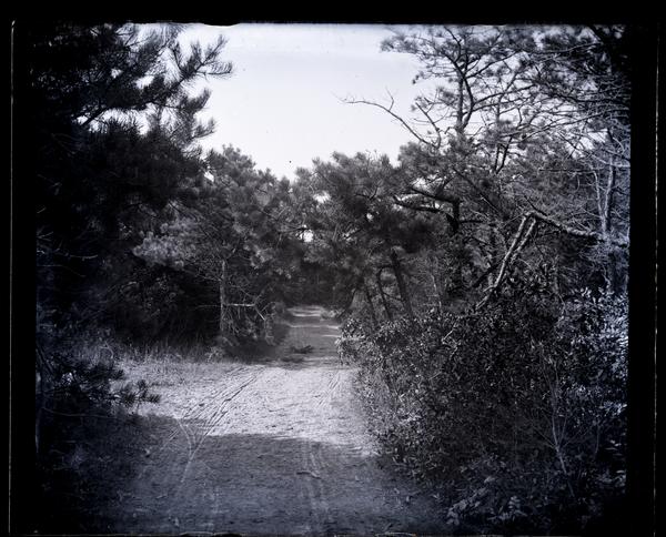 Glass negative showing a dirt path lined with wheel tracks. Trees and other foliage grow thickly on either side of the path.