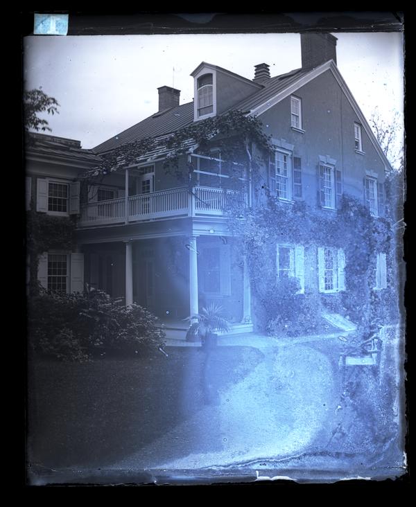 Glass negative showing the two-story Deshler-Morris House (later 5442 Germantown Avenue) with shuttered windows and a balcony on the second floor. Photo taken from the yard, facing the house diagonally. David Deshler built the original four-room summer cottage on this Germantown lot in 1752, adding the three-story front addition in 1772. The house was sold to Col. Isaac Franks in 1792 after Deshler’s death. President George Washington rented the home for the duration of the yellow fever epidemic of 1793 and the summer of 1794. Elliston and John Perot purchased the house in 1804, selling it to Elliston’s son-in-law Samuel B. Morris after his death in 1834. The house stayed in the possession of the Morris family for over a century, when Elliston P. Morris donated the house to the National Parks Service in 1948. The name was officially changed to the Germantown White House in 2009.