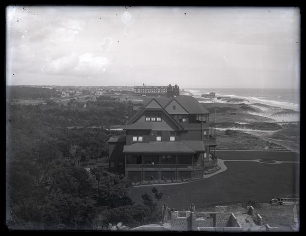 Glass negative showing a view of Margaret Antoinette Oglesby's multi-story house seen from above at a distance. Two people stand on the wide porch located on the first level. Balconies are on the second and third floors. A path circles around a flower bed in the front lawn. Trees grow behind the house and the ocean and possibly Tremont House are visible in the distance. Construction of Phoeve Wright's house is visible in the foreground. Oglesby’s husband Joseph built their house in 1887, but died before it was completed. She and her son continued to live in the house until his death in 1963. The house later burned down. Phoebe Wright was a prominent Quaker philanthropist. Her house was built in 1890 and was the only vacation home in Sea Girt from this time period to survive into the 21st century.