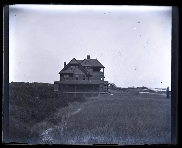 Glass negative showing Margaret Antoinette Oglesby's multi-story house standing behind a grassy lawn and a field of dune grass. The house has a wide, wraparound porch and a balcony on the thrid floor. Other houses are visible in the distance overlooking the ocean. Oglesby’s husband Joseph built their house in 1887, but died before it was completed. She and her son continued to live in the house until his death in 1963. The house later burned down.