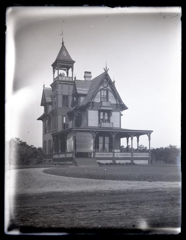 Glass negative showing a view of Avocado, the Morris family's multi-story house at Sea Girt, N.J., with a porch, tracery in the gables and a tower with a balcony. Two women, possibly Marriott C. Morris' sister Elizabeth Canby Morris and mother Martha Canby Morris, stand on the high balcony and carpets hang from the porch. Elliston Perot Morris bought property in Sea Girt, N.J. in 1875, where he built the summer home Avocado after designs by Quaker architect Hibberd Yarnall. Morris left Avocado, named after a Perot family estate in Bermuda, to his daughter Elizabeth Canby Morris in his will. It was sold in 1947 after her death. By 1958 the house had been demolished.